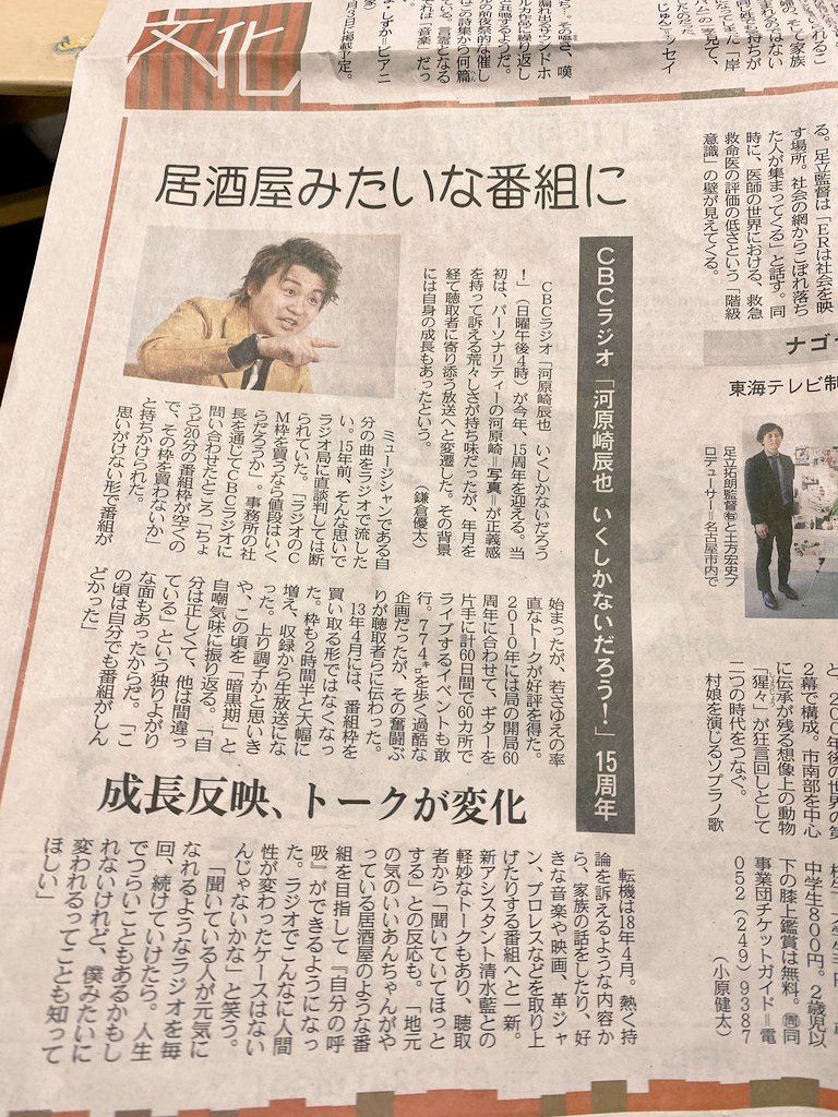 HOME NEWS MEDIA INFO NEWS What's New Live Info Media Info Other Info MEDIA INFO 中日新聞に番組15周年を取り上げて頂きました! 中日新聞にCBCラジオ河原崎辰也いくしかないだろう! 15周年、取り上げて頂きました! 引き続き一回一回楽しく みなさまと笑っていけたら はじめましての方もお待ちしてます 番組を聞いてくださり いつも本当にありがとうございます
